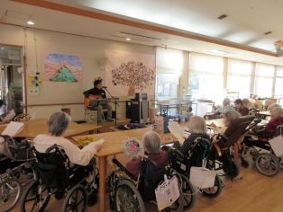 先日、職員の安達さんによる弾き語りライブを開催しました。『カンカン娘』や『また逢う日まで』『憧れのハワイ航路』や安達さんオリジナルソングを含む10曲を歌ってもらいました。