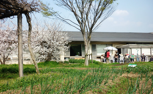 農園中庭にてご利用者と一緒に季節の野菜を作っています。土と触れ合うことで精神面も活性化します。 |